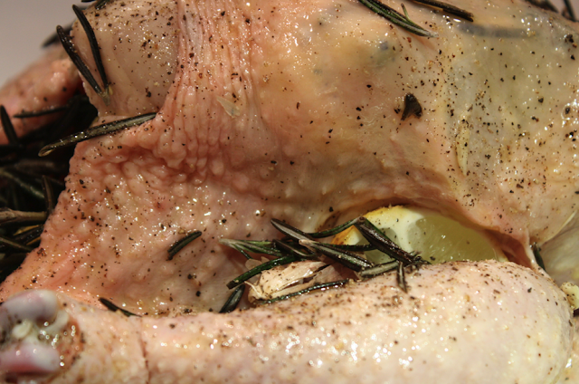 13. Stuff the rest of the lemon slices into the chicken carcass as well as any remaining rosemary sticks.